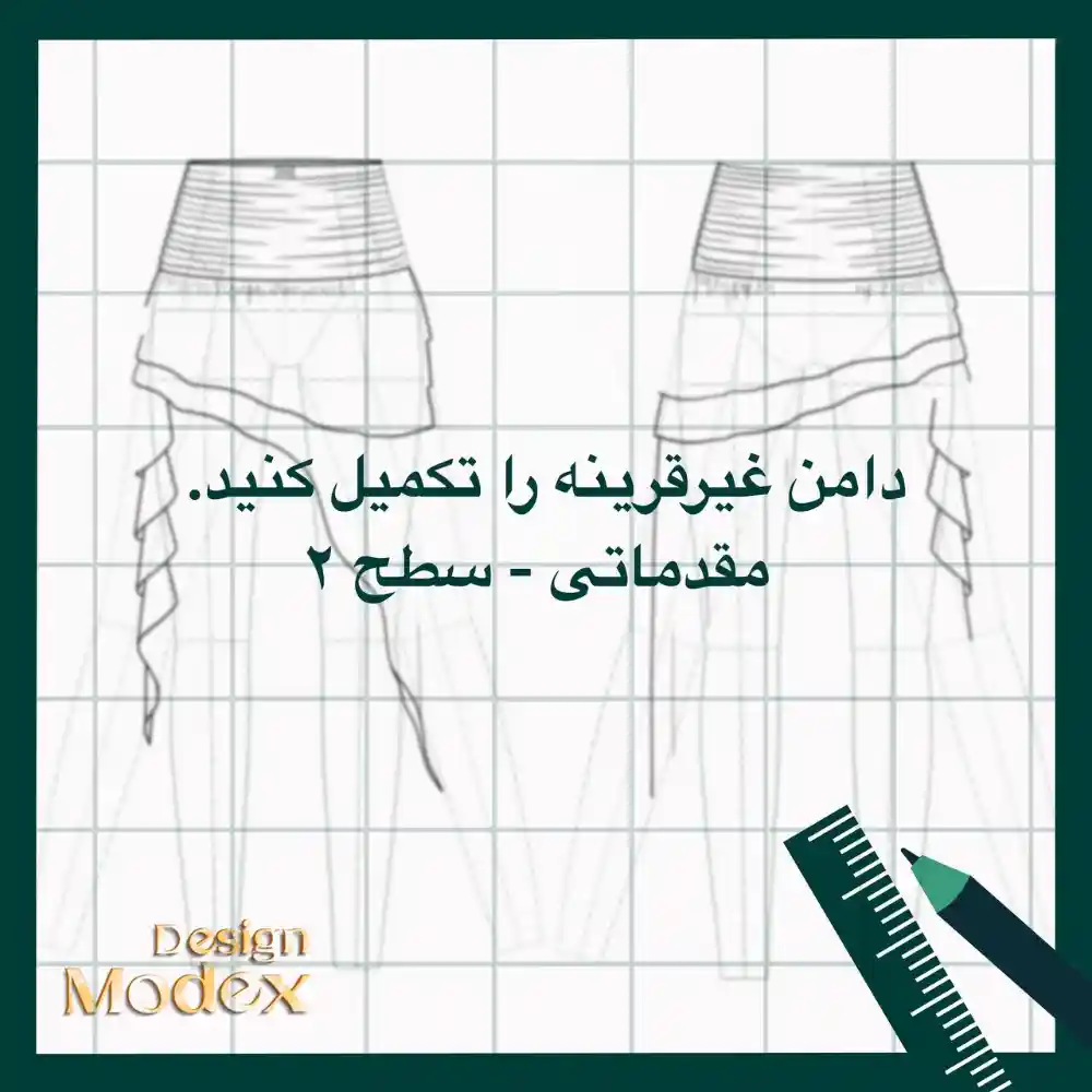 در سطح دو، طراح باید بتواند علاوه بر رعایت اصول پایه، با فرمهای متنوعتری کار کند. دامن غیرقرینه یکی از مهمترین آیتمها برای ورود به دنیای طراحی مدرن است و تمرین صحیح آن، نقش کلیدی در رشد مهارتهای فنی و خلاقانه طراح دارد.